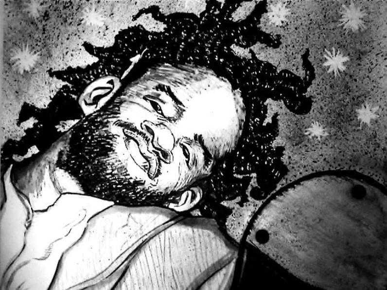 A caricature montage-painting, of Savion Glover (from a magazine photo).